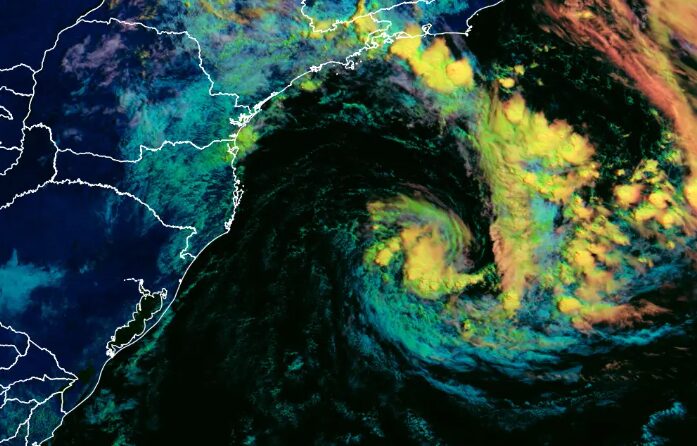 Ciclone atípico avança para o continente com ventos de 90 km/h. Risco de granizo e trombas d’água nas regiões Sul, Sudeste e Centro-Oeste.