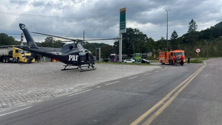 Gestante ferida em acidente na PR-092 é resgatada de helicóptero em Rio Branco do Sul e levada ao Hospital do Trabalhador.