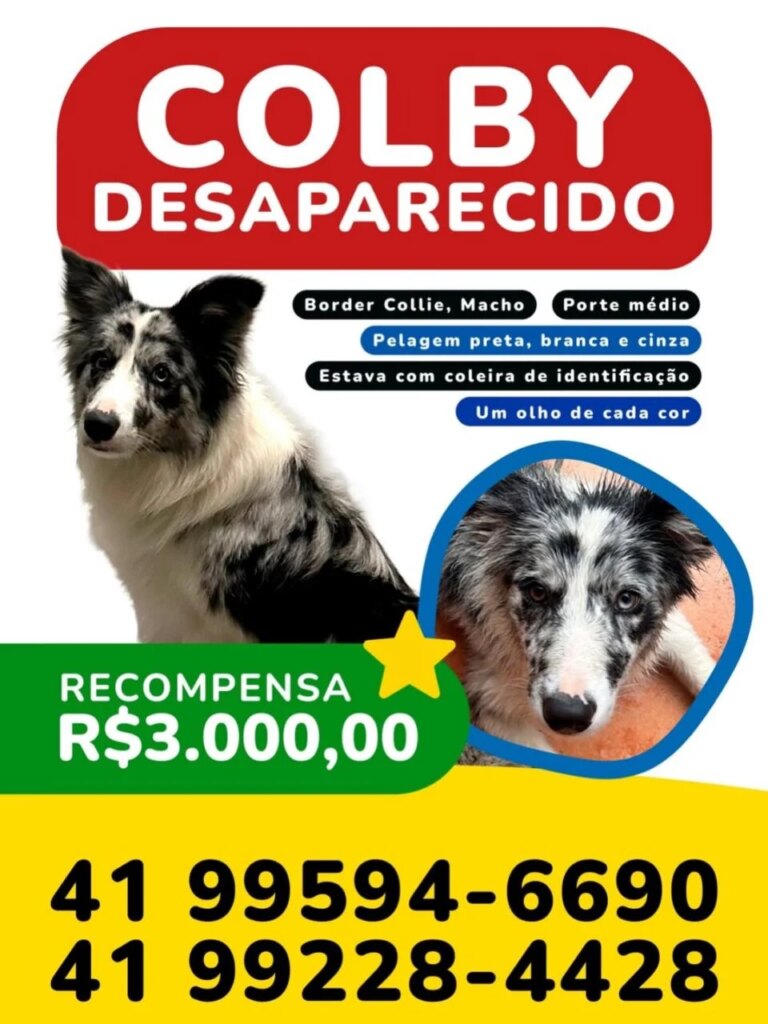 Cão desapareceu há 25 dias em Curitiba. Tutora oferece R$ 3 mil. Polícia Civil investiga. #ProcuraSeColby