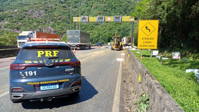 BR-376 interditada em Guaratuba (PR) após batida de caminhões com carga de peixe. PRF bloqueia km 662. Um ferido leve. Congestionamento de 11 km.