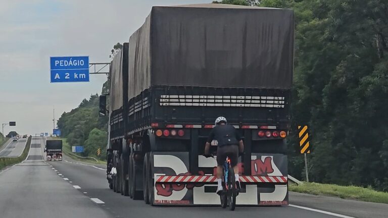 Ciclista flagrado em "pegar rabeira" em carreta. Prática perigosa e agora ilegal em Curitiba, com multas de R$600 e apreensão do veículo.