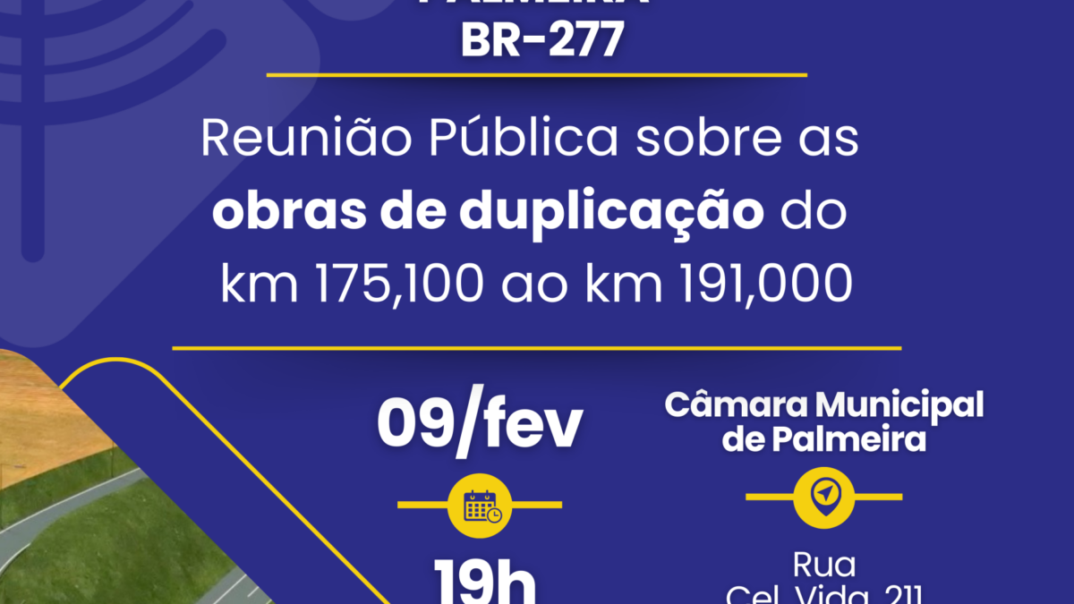A concessionária Via Araucária anunciou a realização de uma reunião pública com a população de Palmeira para discutir o processo de licenciamento ambiental referente a obras de duplicação na BR-277. O evento, agendado para o dia 9 de fevereiro, tem como principal objetivo promover o diálogo transparente sobre as intervenções previstas no trecho entre os quilômetros 175,100 e 191 da rodovia federal, permitindo que a comunidade apresente suas dúvidas e contribuições.