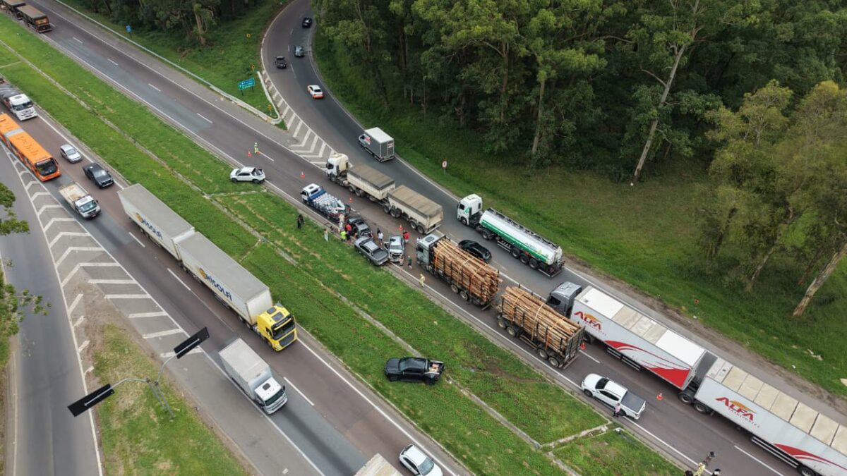 Um grave engavetamento envolvendo sete veículos, incluindo uma carreta bitrem carregada com toras de madeira, bloqueia completamente a pista sentido Campo Largo no Contorno Sul, na Região Metropolitana de Curitiba. O incidente ocorreu na manhã desta terça-feira (3), por volta das 10h40, na altura do km 605 da BR-376. As autoridades não oferecem previsão para a liberação da via, gerando longos congestionamentos.