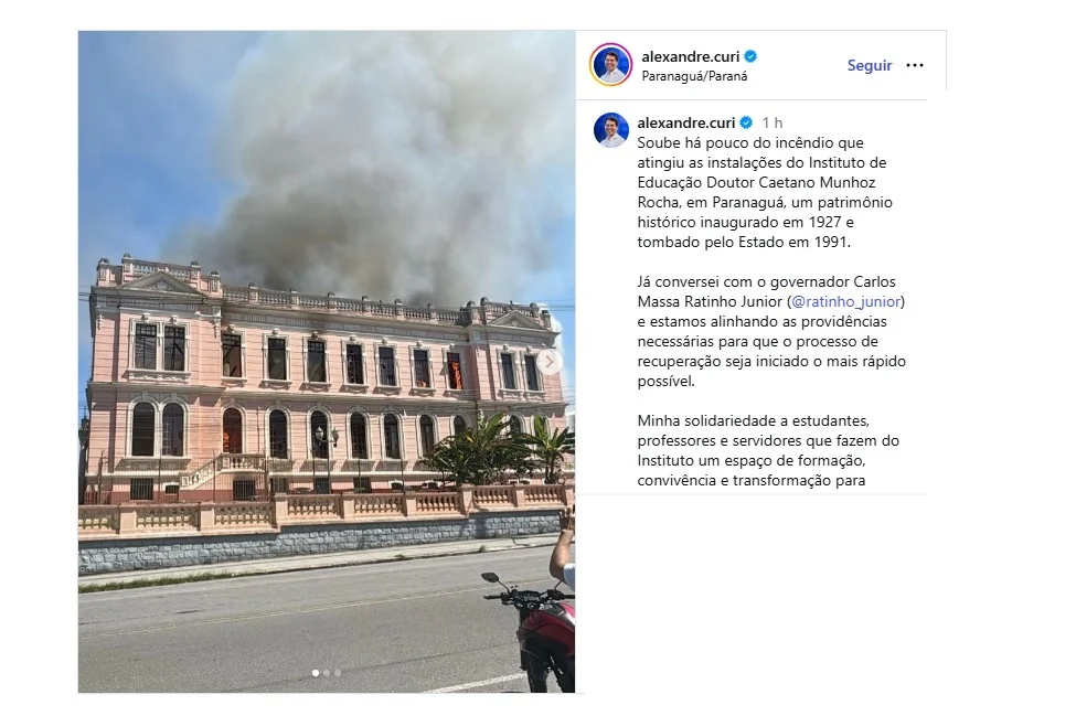 Um incêndio de grandes proporções consumiu parte do histórico Instituto Estadual de Educação Dr. Caetano Munhoz da Rocha, em Paranaguá, no litoral do Paraná, no último sábado (4). O incidente, que mobilizou equipes de combate a incêndio, gerou uma rápida resposta do governo estadual, com a determinação de uma força-tarefa para avaliar os danos e planejar a recuperação do edifício, um marco arquitetônico e educacional para a região.