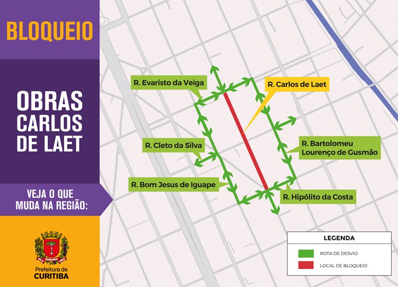 No sentido leste da Rua Cleto da Silva, o cruzamento com a Rua Carlos de Laet será fechado. A rota de desvio sugerida envolve a Rua Bom Jesus de Iguape, com acesso posterior às ruas Hipólito da Costa ou Evaristo da Veiga, e pela Rua Bartolomeu Lourenço de Gusmão para retornar à Cleto da Silva.