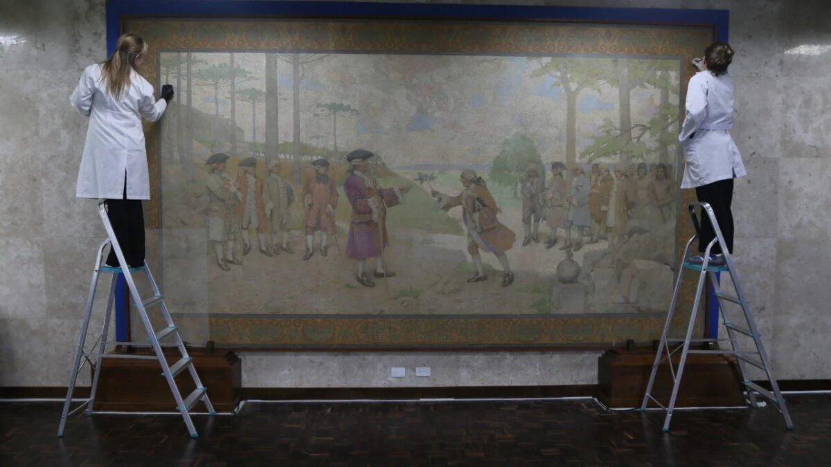 Uma importante obra de arte histórica, a pintura “Acto da Demarcação do Districto da Villa de Curityba”, datada de 1922 e assinada por Belmiro Barbosa de Almeida, foi removida temporariamente do Salão Nobre do Palácio 29 de Março, sede da Prefeitura de Curitiba. A peça, que retrata um marco na consolidação territorial e administrativa da vila, passará por um extenso processo de restauração com previsão de conclusão em novembro de 2026.