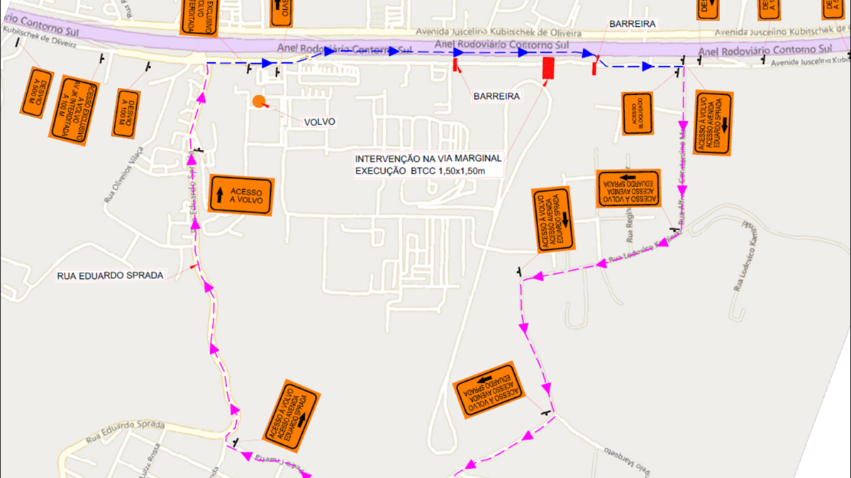 A intervenção exigirá que os condutores deixem a pista principal antes do trecho afetado. Um percurso alternativo será estabelecido através das vias marginais, com desvio pelas imediações da fábrica da Volvo.